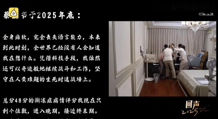 今天看到蔡磊发了一段视频,是他去年还能说话时录的。那时候他还可以说话,能控制嘴巴和下巴,现在这些功能都没了。他说,这段视频本想藏起来不放,但现在放出来,是因为他已经失声了。