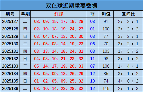 双色球上期开出奖号:08 10 14 23 28 32+12,和值115,区间比2:1:3