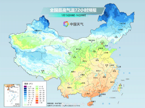 预计回暖会持续到1月16日,白天最高气温回升非常显著,与1月11日气温低点相比,华北到江南多地最高气温累计升幅可达8℃至12℃,山东、河南、江苏多地升幅可达15℃上下。