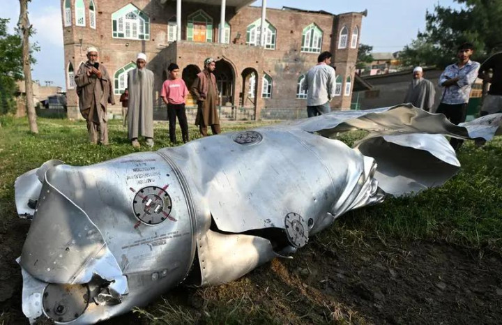 5月7日,在印控克什米尔首府斯利那加附近的普尔瓦马地区,人们围观飞机残骸。(图源:新华社)